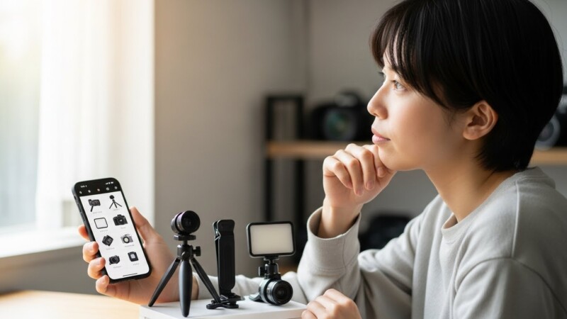必要なもの・撮り方・費用を整理すると、「スマホ本体(既に所持)+スマホ三脚+リングライト or 小型LEDライト+レンズクリーナー+簡易背景」の5点がコスパの良い最低限セットで、すべてそろえても概ね1万円前後におさまります。