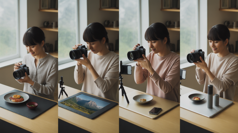 - 撮影ボード(白・木目など)、小型LEDライト、簡易レフ板(白い紙やボード)、三脚。