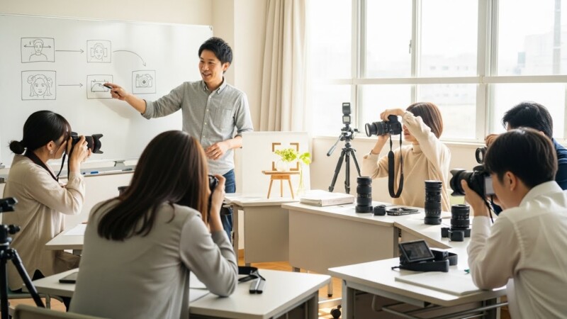 たとえば、メーカー系アカデミーの初心者講座では、1〜2日の集中講座で撮影モード・露出・ピントを集中的に学び、その場で試し撮りをして理解を定着させるスタイルが採用されています。