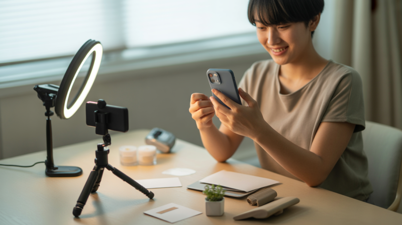 1. 必要なものは「三脚付き自撮り棒+Bluetoothリモコン+小型ライト+無料編集アプリ」の4点を押さえれば十分です。これだけで自撮り・風景・物撮りまでひと通り対応できます。