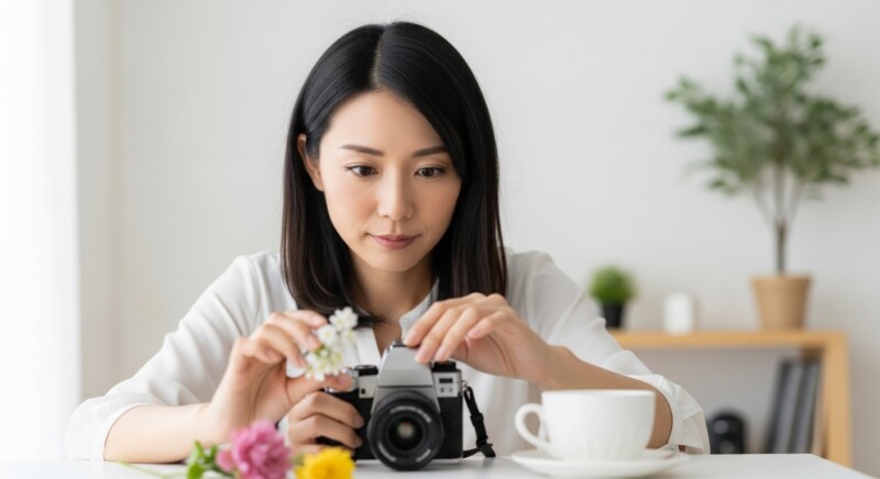 一言で言うと、「通学型は実際のロケーションで、オンライン型は自宅環境で構図バランスを学べる」という違いがあります。メーカー系や大手写真教室では、スタジオや屋外ロケで構図を実践的に学べるコースがあり、初心者でも基礎から体系的に構図を学びやすい環境が整っています。一方で、オンラインZOOMレッスンでは、自宅周りのものを被写体にしながら構図とバランスの取り方を練習できるため、レッスン後も同じ環境で復習しやすいメリットがあります。